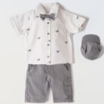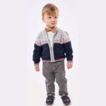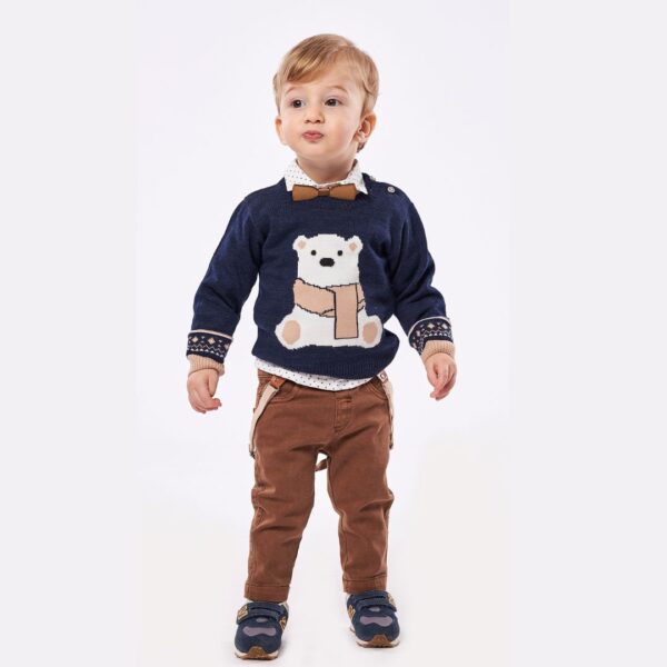 Σετ βρεφικό τριπλέτα με ζακετάκι.Το σετ αποτελείτε απο παντελονάκι καμπαρτίνα καφέ με μπλε τιράντες, πουκαμισάκι λευκό με σχεδιάκια, μπλουζάκι πλεχτώ μπλε και ξύλινο παπιόν