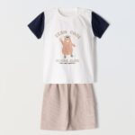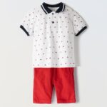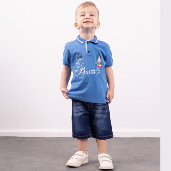 Σετ βρεφικό σορτσάκι 2τμχ. Το σετ αποτελείται από σορτσάκι τζιν με τιράντες και μπλε μπλουζάκι με γιακά.
